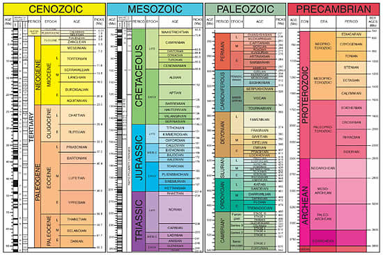 The earth has been around for a very long time. The geological timescale using eons, eras, epochs, periods and ages is one way of breaking that immense time into useable chunks. It’s often represented something like this …
