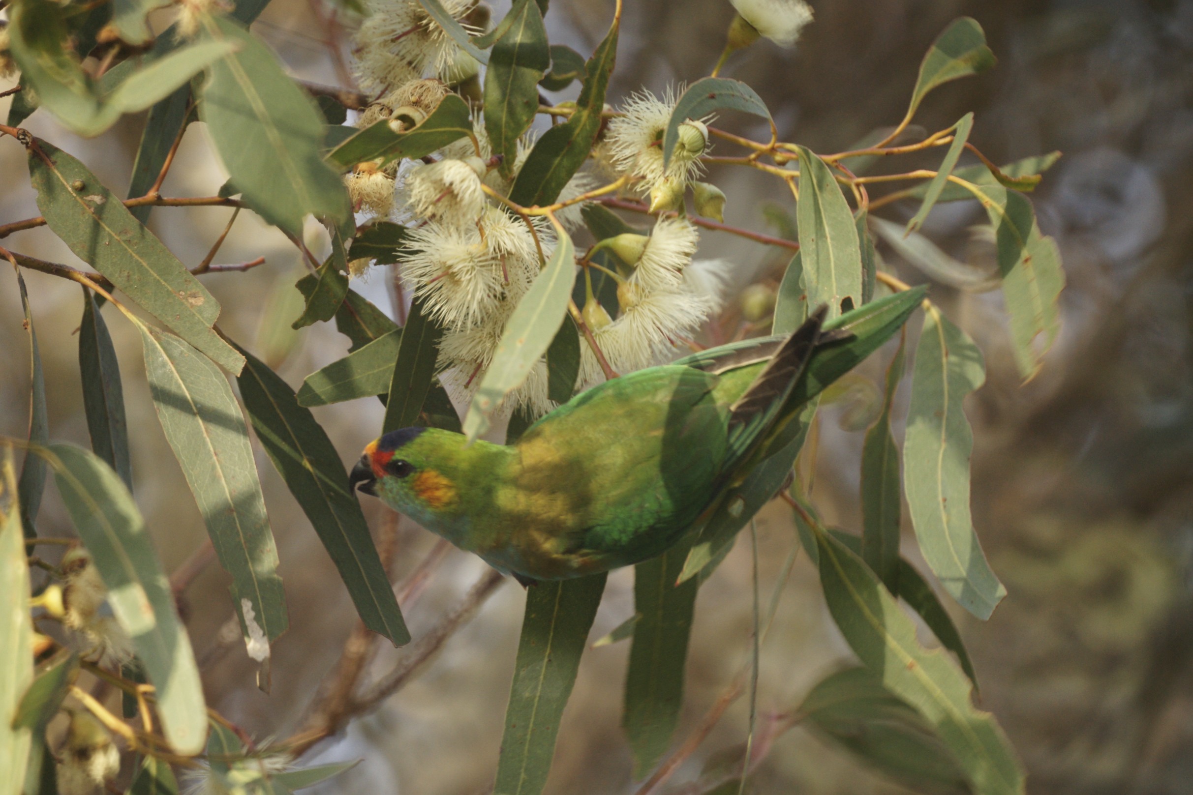 Despite the dry the eucalypts are flowering strongly, the nomadic nectar feeders are making the most of it. In the last couple of weeks the regular Musk Lorikeets have been joined by both Little and Purple-crowned Lorikeets, beautiful flashes of green dashing about, easily heard but often difficult to get a good look at. On Saturday a group of Purple-crowns decided it was time to present themselves for a photo shoot. I have never had such close views. The light was splendid, they were apparently unconcerned at my presence … all I needed was the camera.