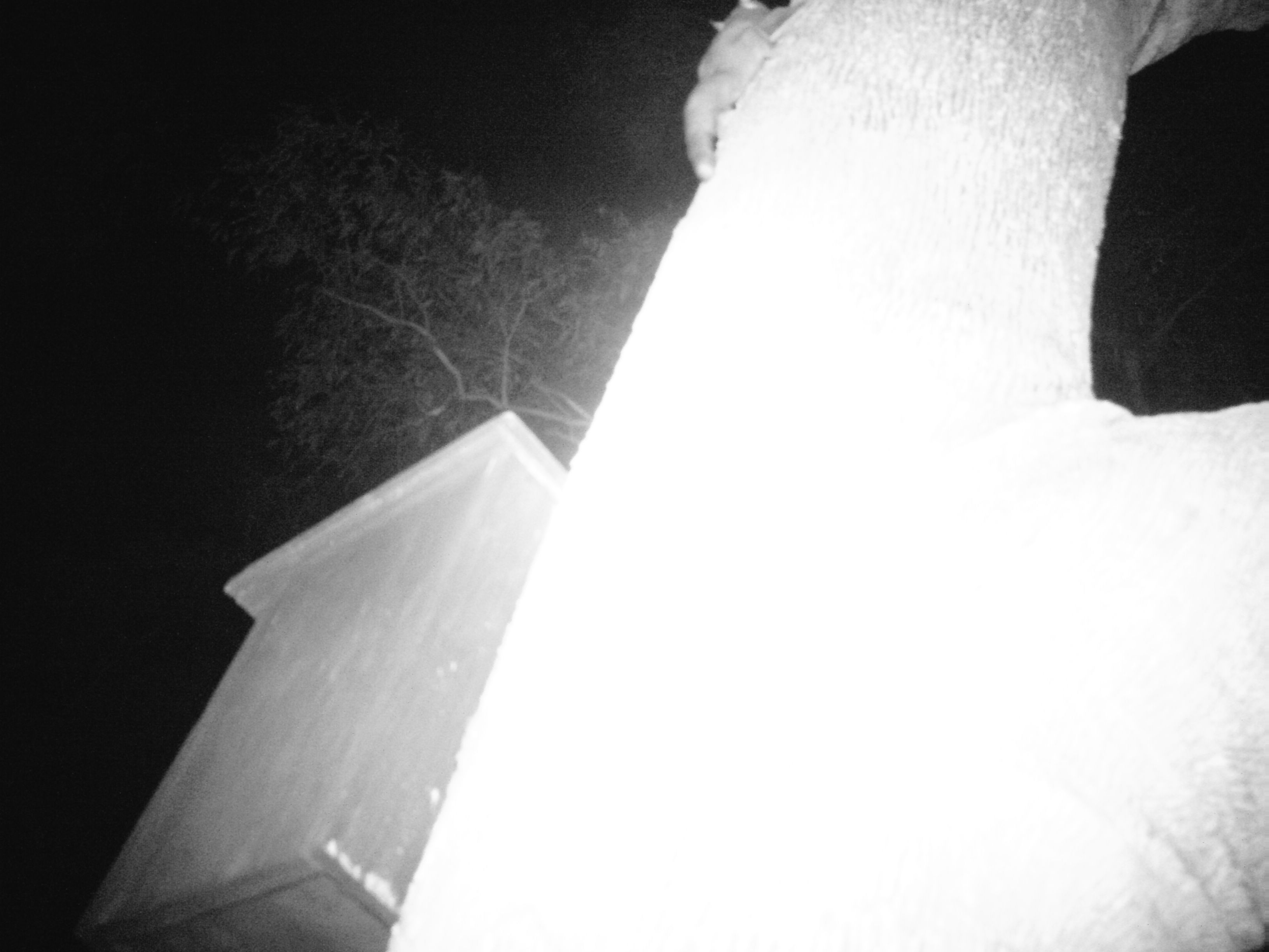 I subsequently bought a Trail Camera from Faunatech. It is mosquito-proof. I mounted it where it could see the box and also the canopy. It sat there for two nights and three days. It took pictures, almost exclusively of the canopy swaying in the breeze, by day this looks conventional enough, at night it uses infrared. I then examined more than 1200 photographs of a tree, a box and some swaying leaves and found four photos with a critter included. Here’s one …