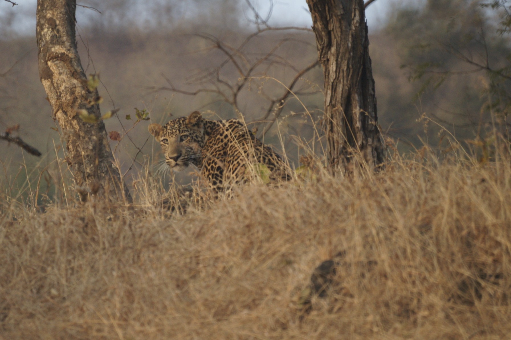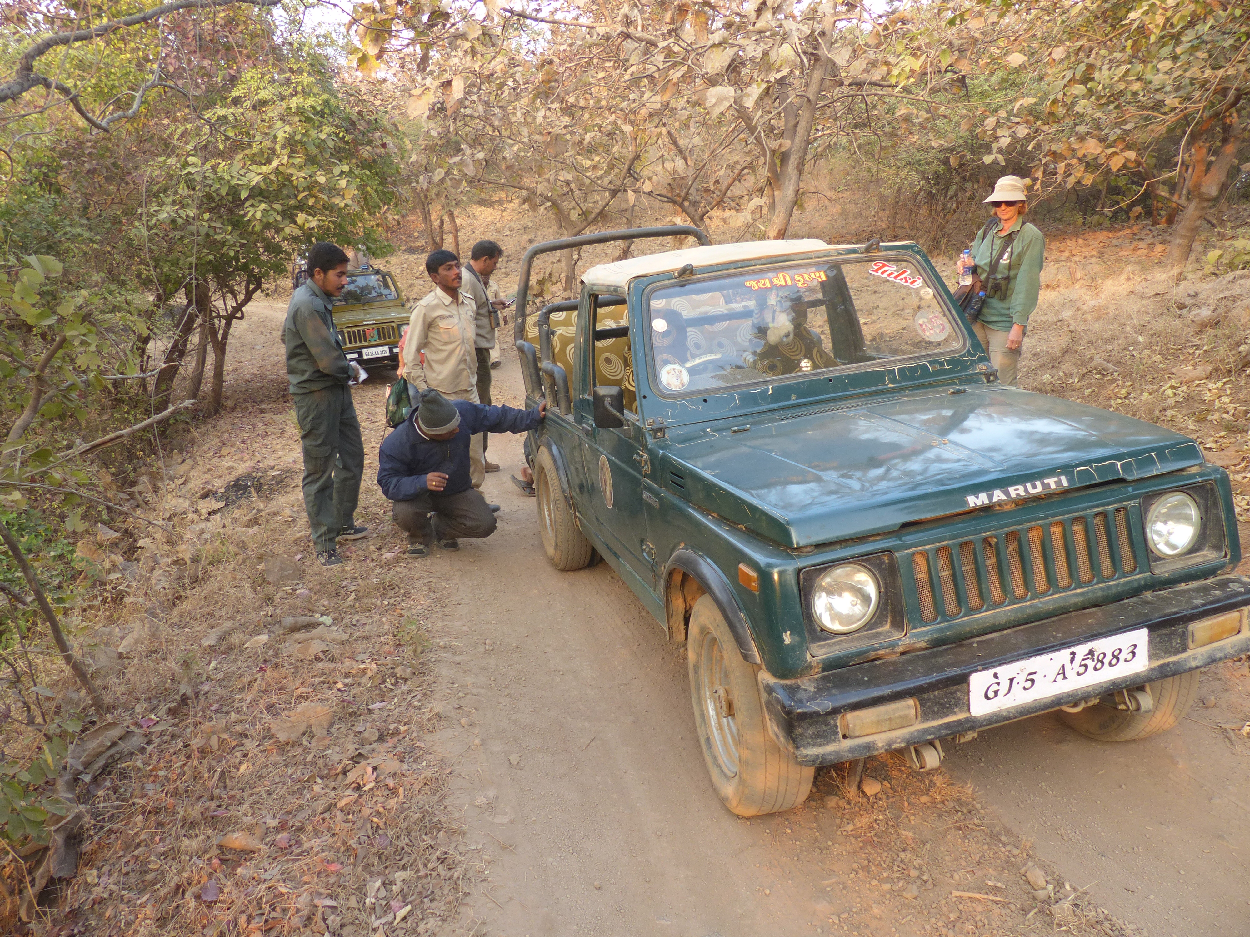 Once through the gate you are on a dusty road, probably in an open jeep known locally as a Gypsy. The forest is composed mainly of Teak trees but because the region is so dry these are not the huge trees you may expect. They have large leaves which were dry and dropping from the branches when I was there. It pays to cover your binoculars and camera whilst on the move to keep the dust at bay, and remember it will be cold in the early morning.