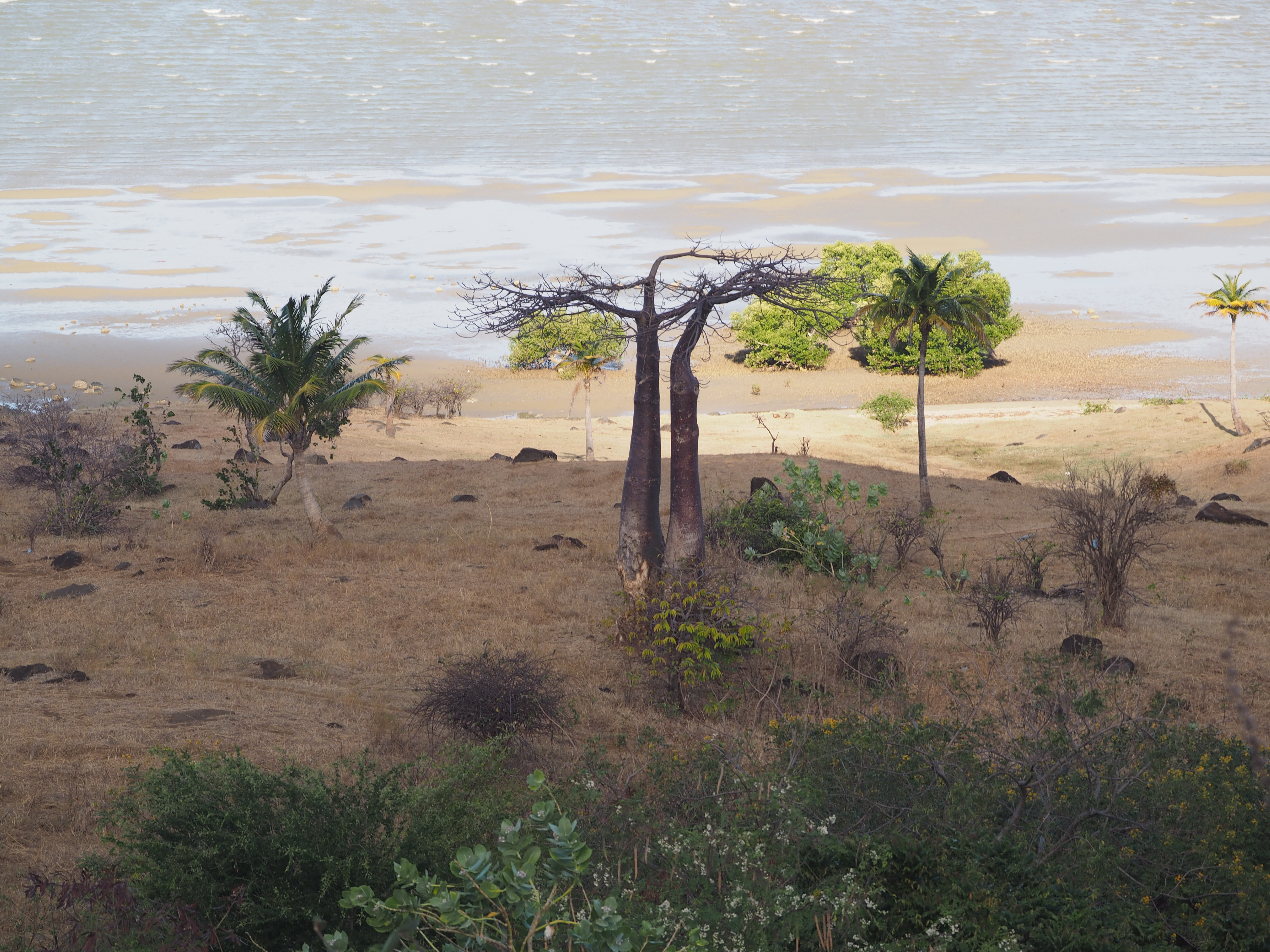 From the shore it looks like this (you’ve gotta click on this one, and say isn’t that an Adansonia suarezensis?) …