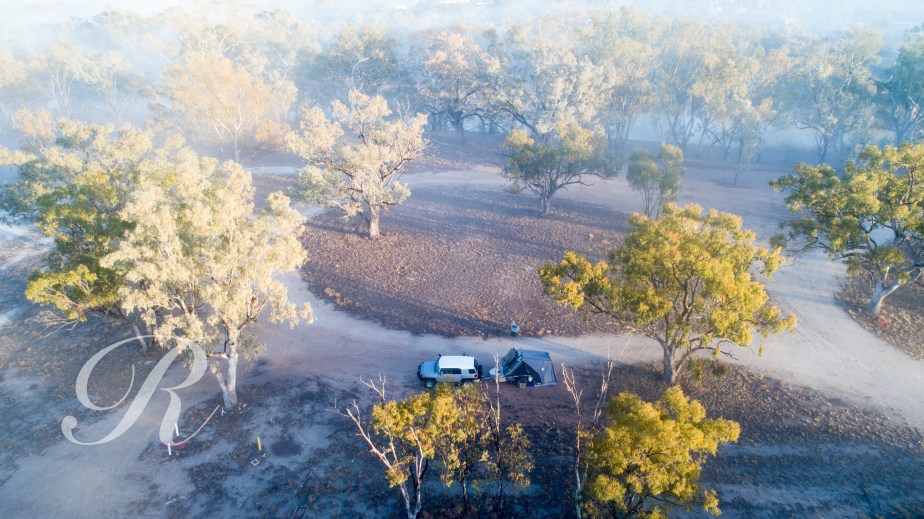 We camped instead on the banks of the Barwon River. When we woke up we could still hear the party going strong. Our campsite was bathed in mist.