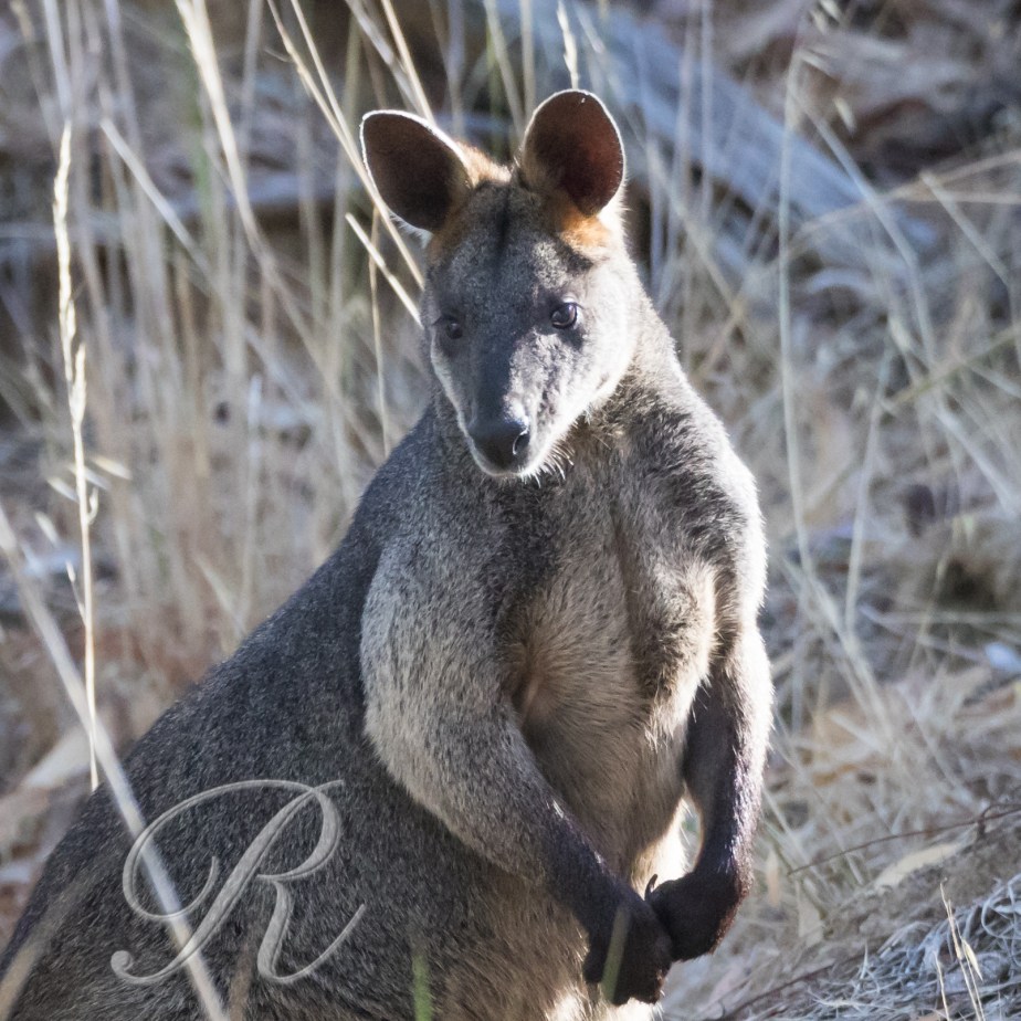 There are two members of the Kangaroo family that are fairly common around the country estate and I encountered both of them on my morning walk. Swamp Wallabies are always around. Eastern Grey Kangaroos come and go. They’re present in fair numbers presently. Brought in, I suspect, by the water that’s available.