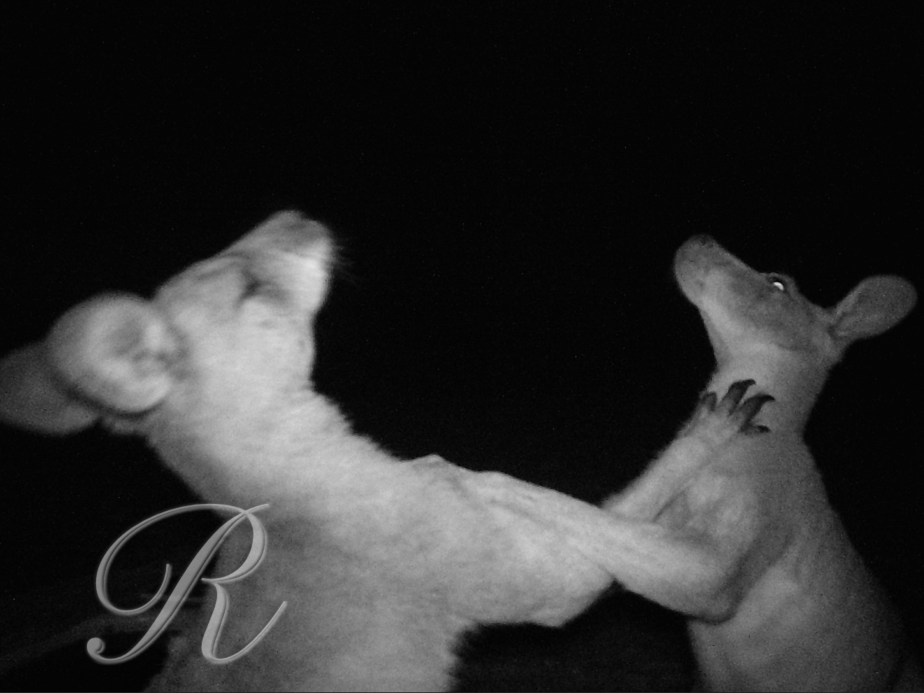 You can see the claws on this big male. One recent night the trail camera caught a couple of roos in a dispute. Thick fur is a useful asset on such occasions …
