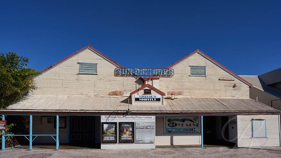 Sun Pictures is the world’s oldest outdoor movie garden. It was built in 1903 as an Asian emporium owned by the Yamasaki family, part of it was used for Noh theatre. Tod Hunter, a pearler, bought it in 1913 and converted it to a cinema holding 500 patrons. It opened in 1916 with a racing drama Kissing Cup. The first talkie was Monte Carlo in 1933.