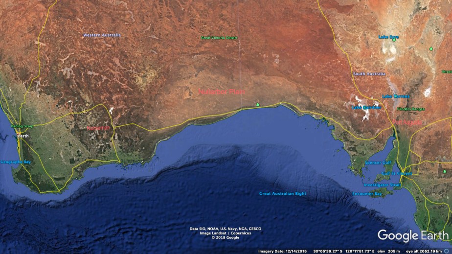 Eyre’s trek, Adelaide to Albany via the modern Eyre Highway is 2,695km (1,675 miles). The journey takes you across the Nullarbor Plain. Between Port Augusta and Norseman I don’t recall seeing any surface water whatsoever, a combination of dry climate (<250mm rain annually) and the limestone geology. Nullarbor comes from Latin and translates as No Trees but in fact much of the journey is through mallee and on the South Australian end there are even wheat fields by the side of the road. Only on the clifftop section near the South Australia border do you really have a barren landscape (although on foot that would seem more than sufficient).