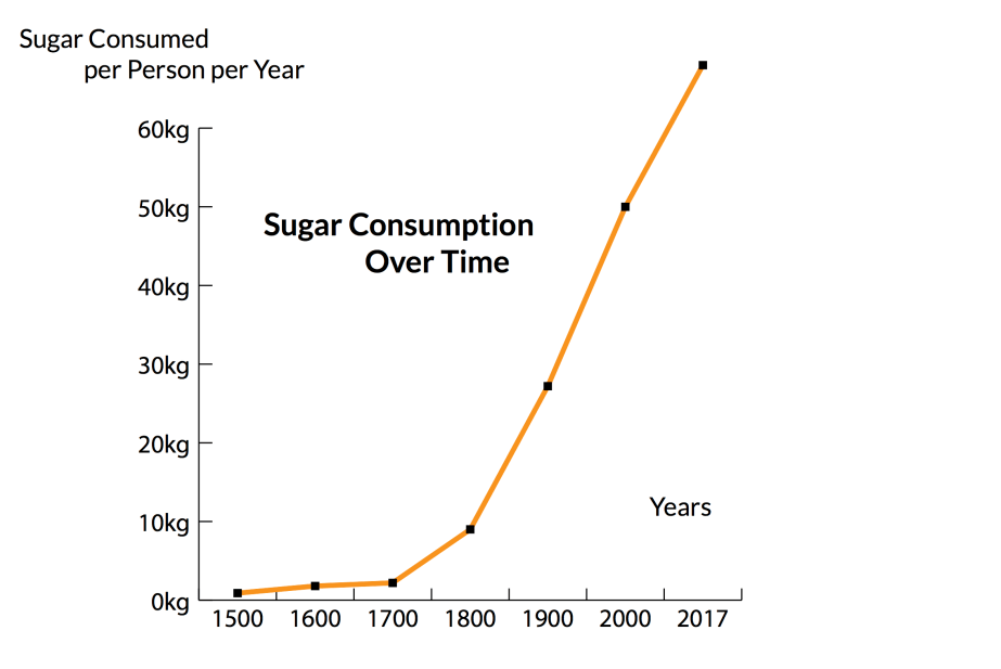 The industrial diet has seen sugar intake rise from negligible amounts to a point where we are eating almost our own weight of sugar a year. Our weight at the beginning of the year that is.