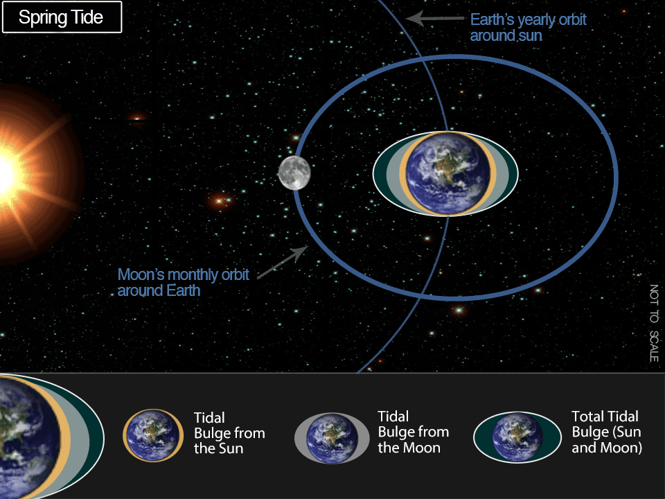 The main engine is the moon. The sun also has its gravitational pull but it is a long way away. Depending on the spatial arrangement it may add to the moon’s effect (spring tide) or subtract (neap tide). The tide is a very long period wave moving around the earth. There is a corresponding bulge on the opposite side. Thus generally there are two tides a day. Big at full and new moon, smaller in between. The spring in spring tide has nothing to do with the season that follows winter.