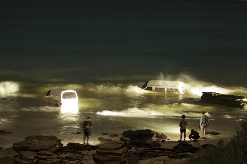 Their return was timely but … the local guy had lost the car keys, the tourist vehicle had a flat battery (lights left on, perhaps – hard to tell now). Help was summoned but by the time it arrived the tide had reached the rocks. And like the people in the photo above all concerned could only stand and watch.