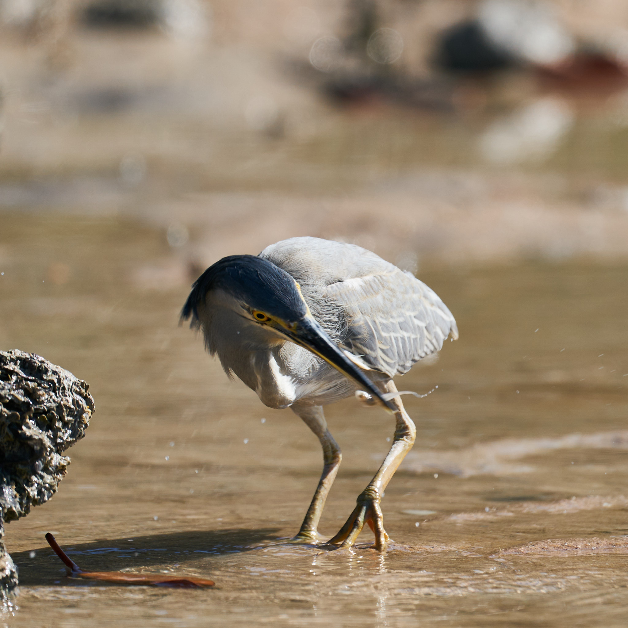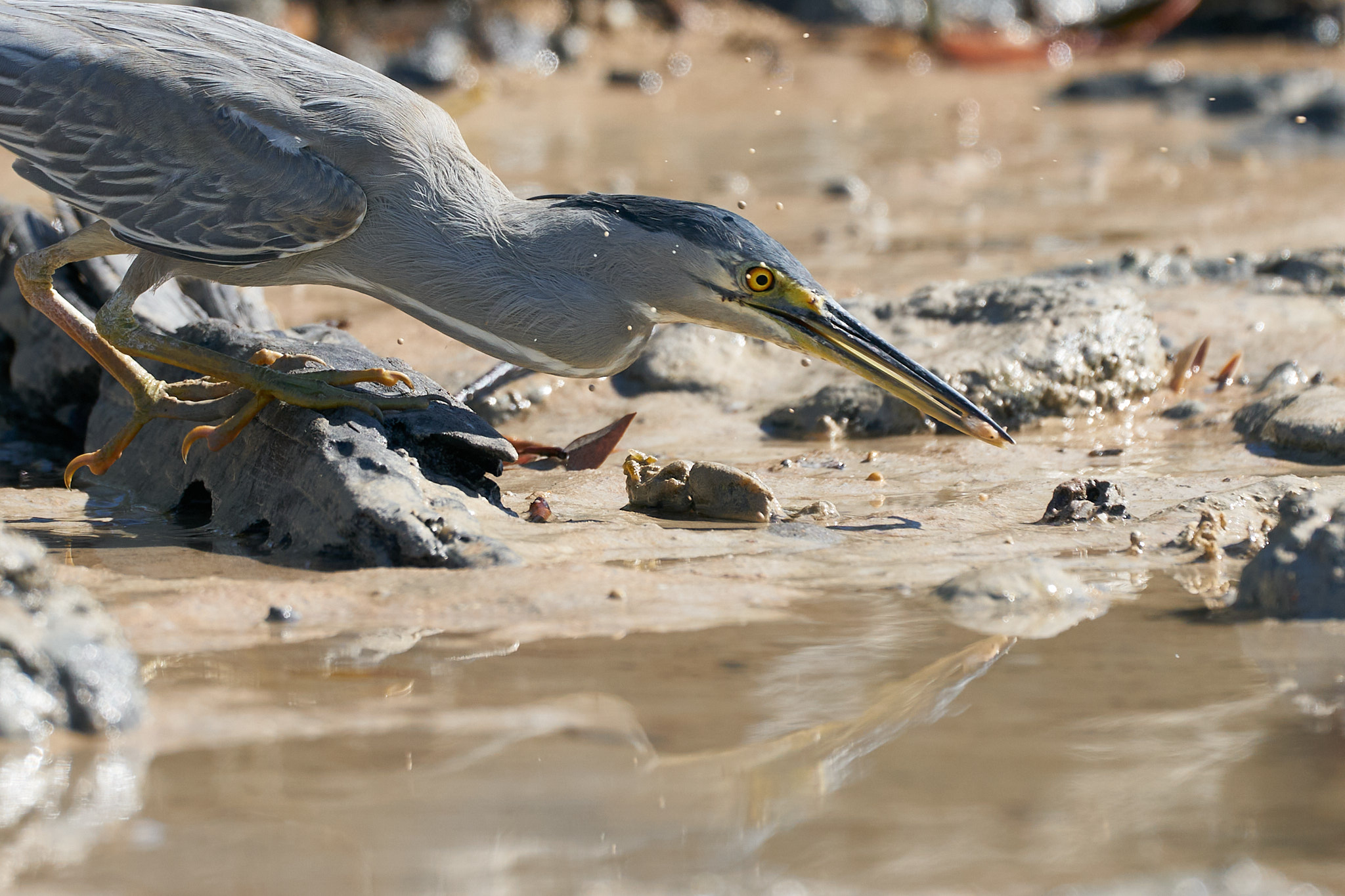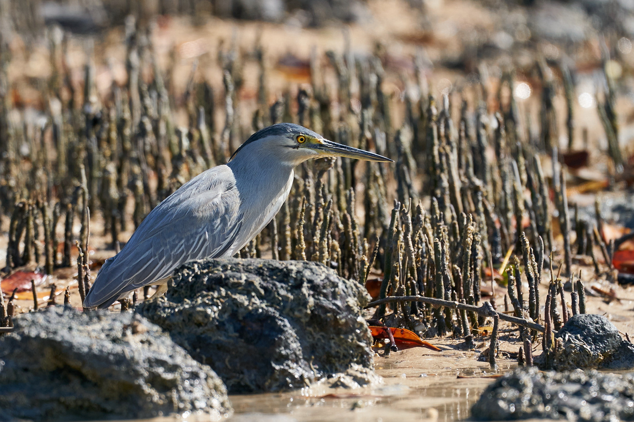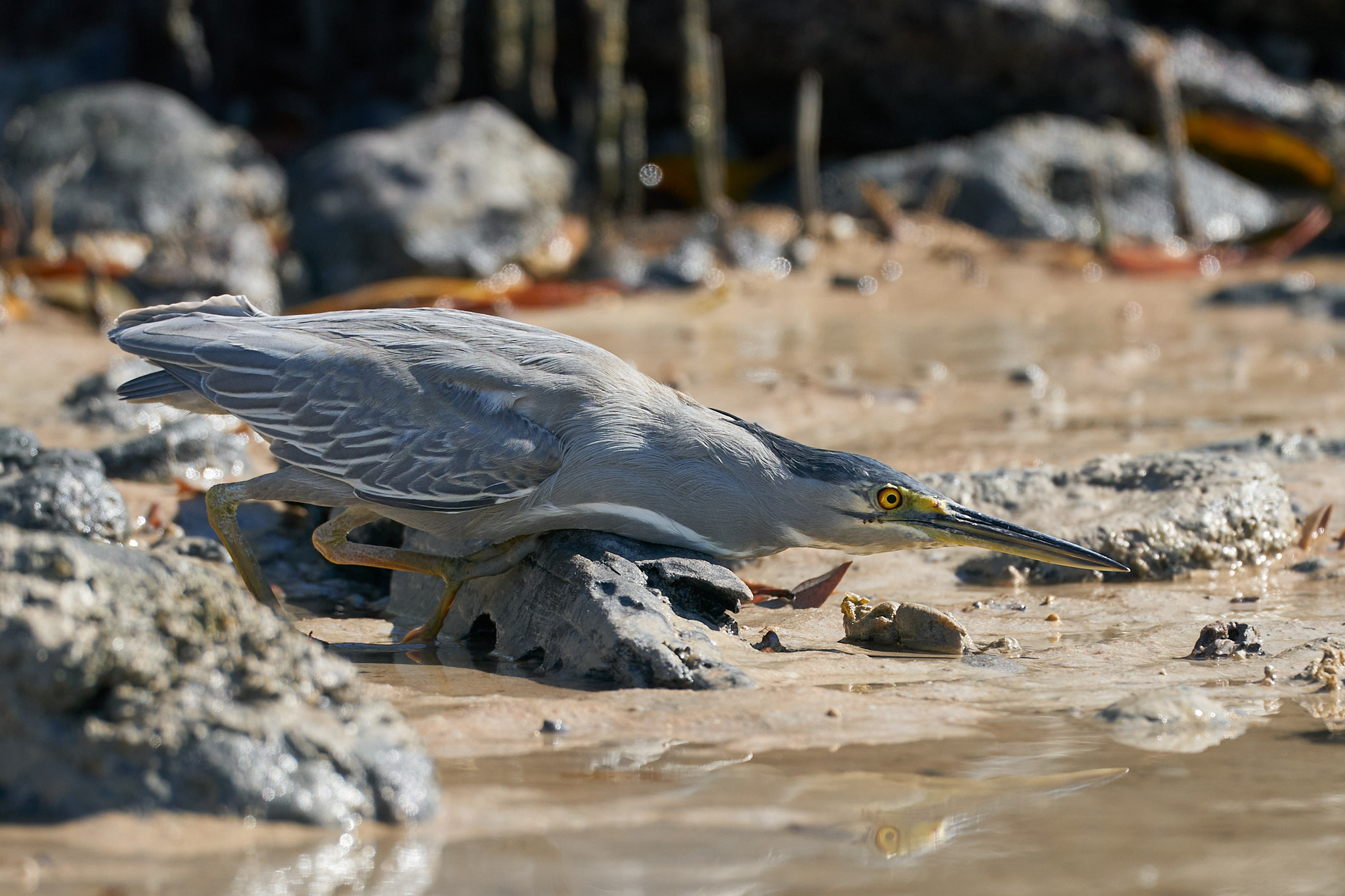 Returning to the beach around the seaward edge of the mangroves I found myself approaching a Striated Heron. It saw me before I saw it and was walking away into the trees. I suspect that stopping informs the bird that you’ve seen it and are interested in it, suspicious behaviour. I change direction, don’t look at the bird and slow down. Going off at a tangent means that the distance to the bird doesn’t decrease. On this occasion it worked well, the bird returned to the water’s edge, I sidled slowly closer. By the time I was kneeling in the sea, fully clothed it thought I was a harmless idiot and resumed feeding.