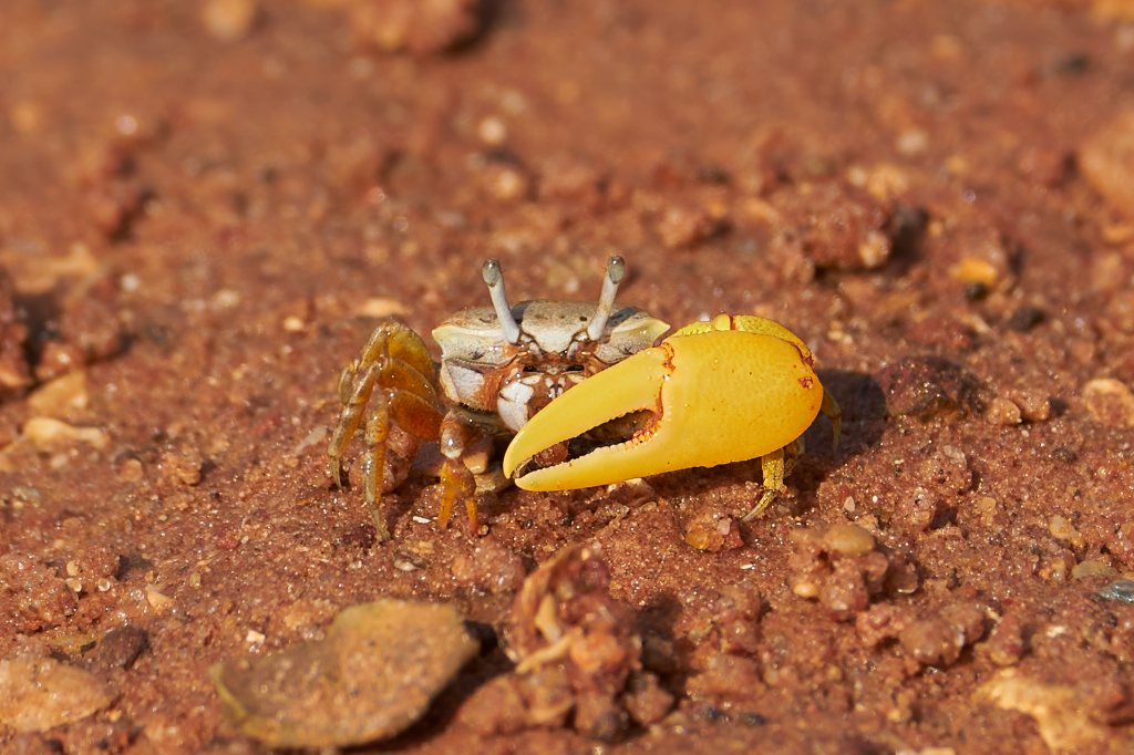 Female fiddlers have two equal feeding claws that they use to gather food and shovel it into their rather complicated mouths. Males have to make do with only one whilst carrying around their dominant claw which is useless for feeding and pay the costs of building it and waving it about.