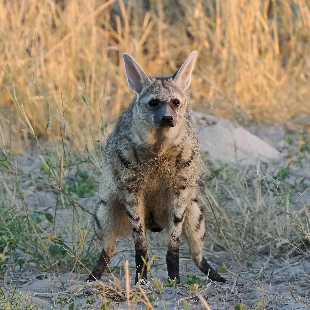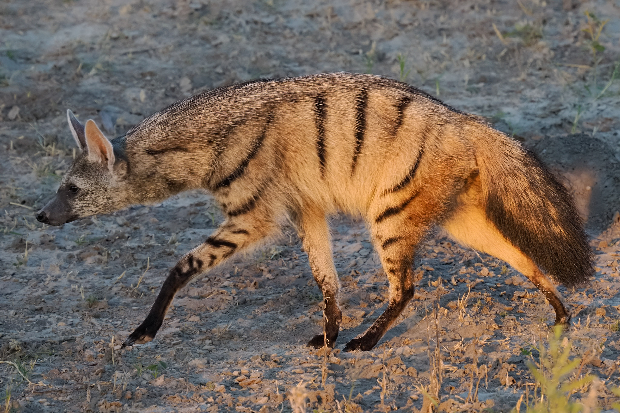 One morning, just as the sun was breaking the horizon we encountered an Aardwolf, a creature I had never seen before. The Earth Wolf from Dutch via Afrikaans. Or if you prefer a cocktail of pseudo-classical languages Proteles cristatus the first word from Greek, the second from Latin. A Hyenid, but unlike it’s cousins not a killer or scavenger of other mammals. Its diet is almost exclusively termites, as many as a quarter of a million in a night. Unlike the Aardvark (Earth Pig) it does not break into termite mounds it laps them up off the ground. They depend on termites of the family Hodotermitidae which themselves depend on dead grasses thus tying the Aardwolf to savanna country.