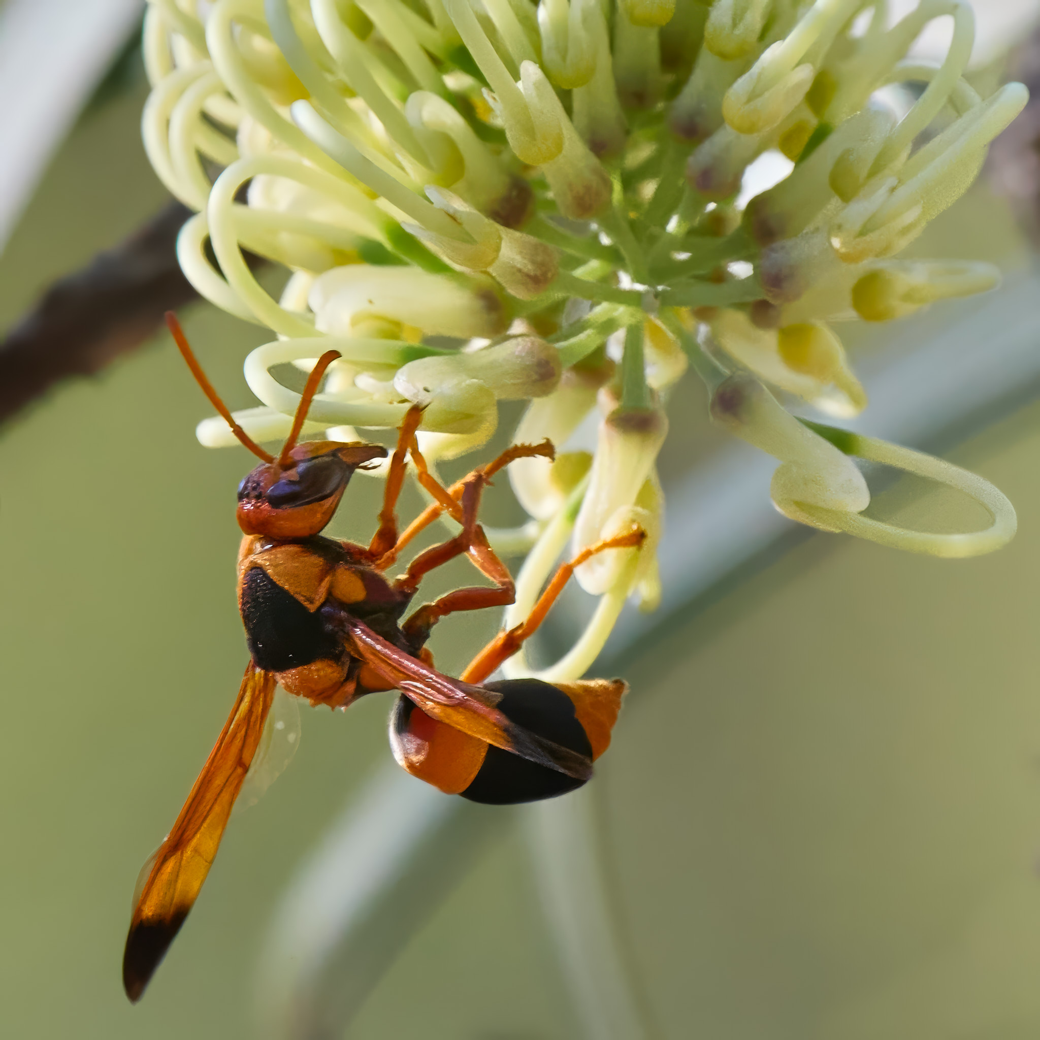 It’s called the Australian Hornet (Abispa ephippium)but it’s not a true hornet and it’s not nearly as nasty. This is one of the potter wasps (subfamily Eumeninae). The female builds a mud nest which it stocks with paralysed spiders for the larvae to feed on. They occur in all the mainland states of Australia.