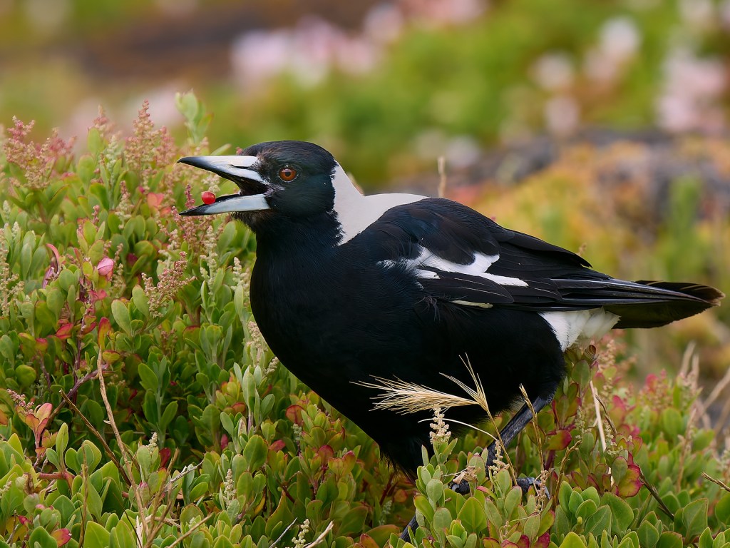 Here’s an Australian Magpie celebrating with a berry.