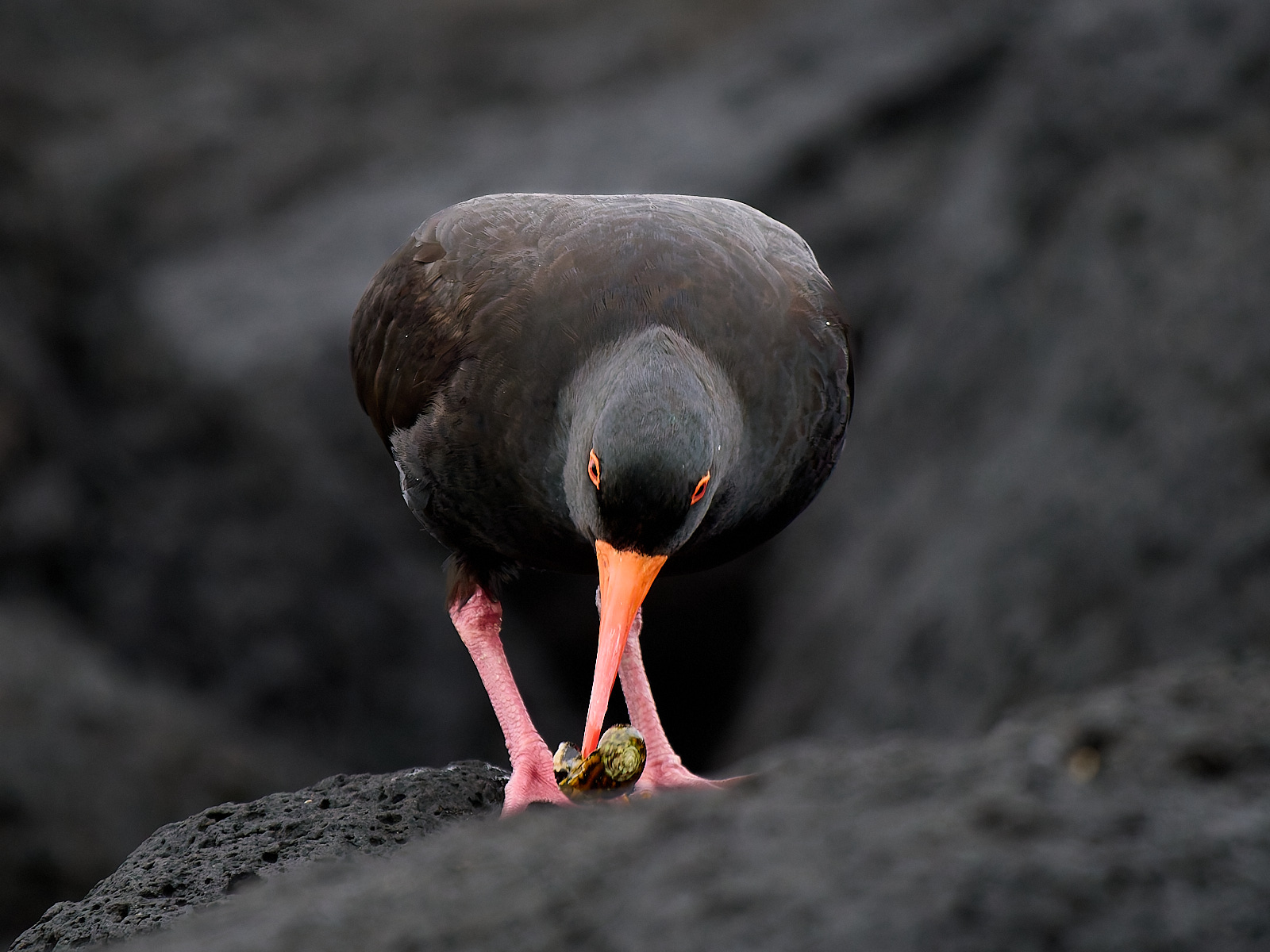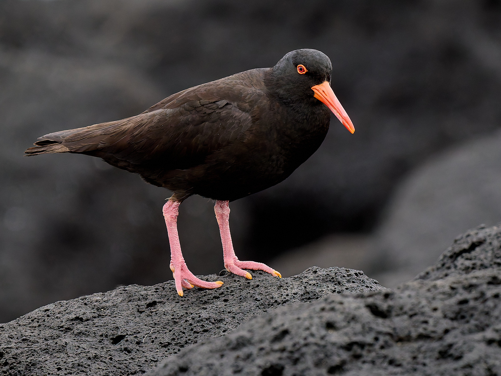 The rocks are fuliginous and the bird is fuliginous. What better way to show off the red bits? It’s the Sooty Oystercatcher. The first of its group to be described was the Eurasian Oystercatcher, Linnaeus 1758. It was the red bits that inspired the genus he created for it, Heamatopus, from the Greek, blood and foot. No surprise then that the Sooty Oystercatcher is Haematopus fuliginosus.