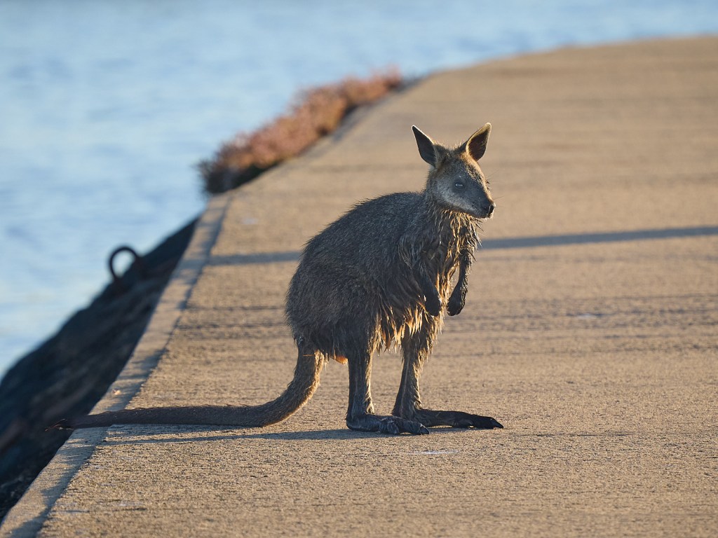 This little guy clambered up onto the causeway to Griffiths Island, Port Fairy. It’s a Swamp Wallaby. They are quite common on the island and sometimes come and go via the causeway. This is the first time that I have seen one choose to swim the Moyne River to get there. Kangaroos and Wallabies swim well as you can see in this Youtube clip …