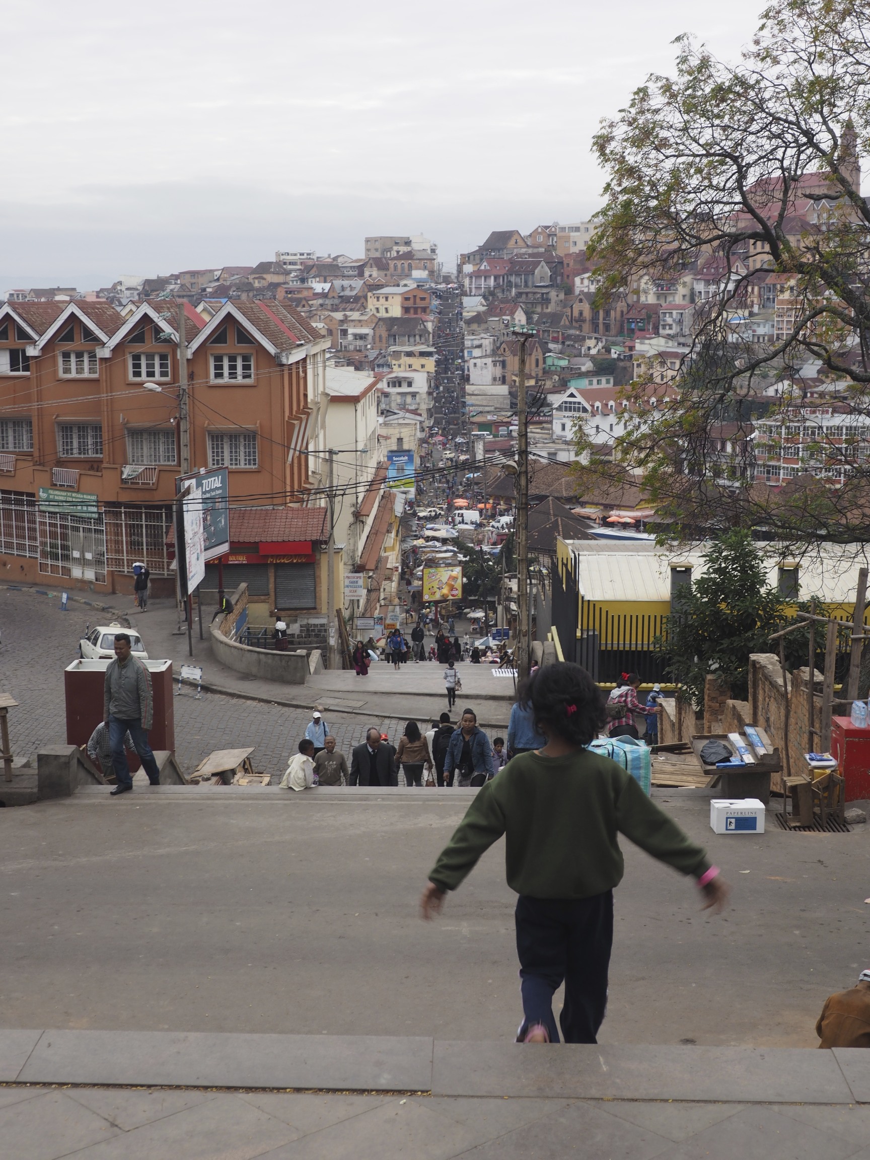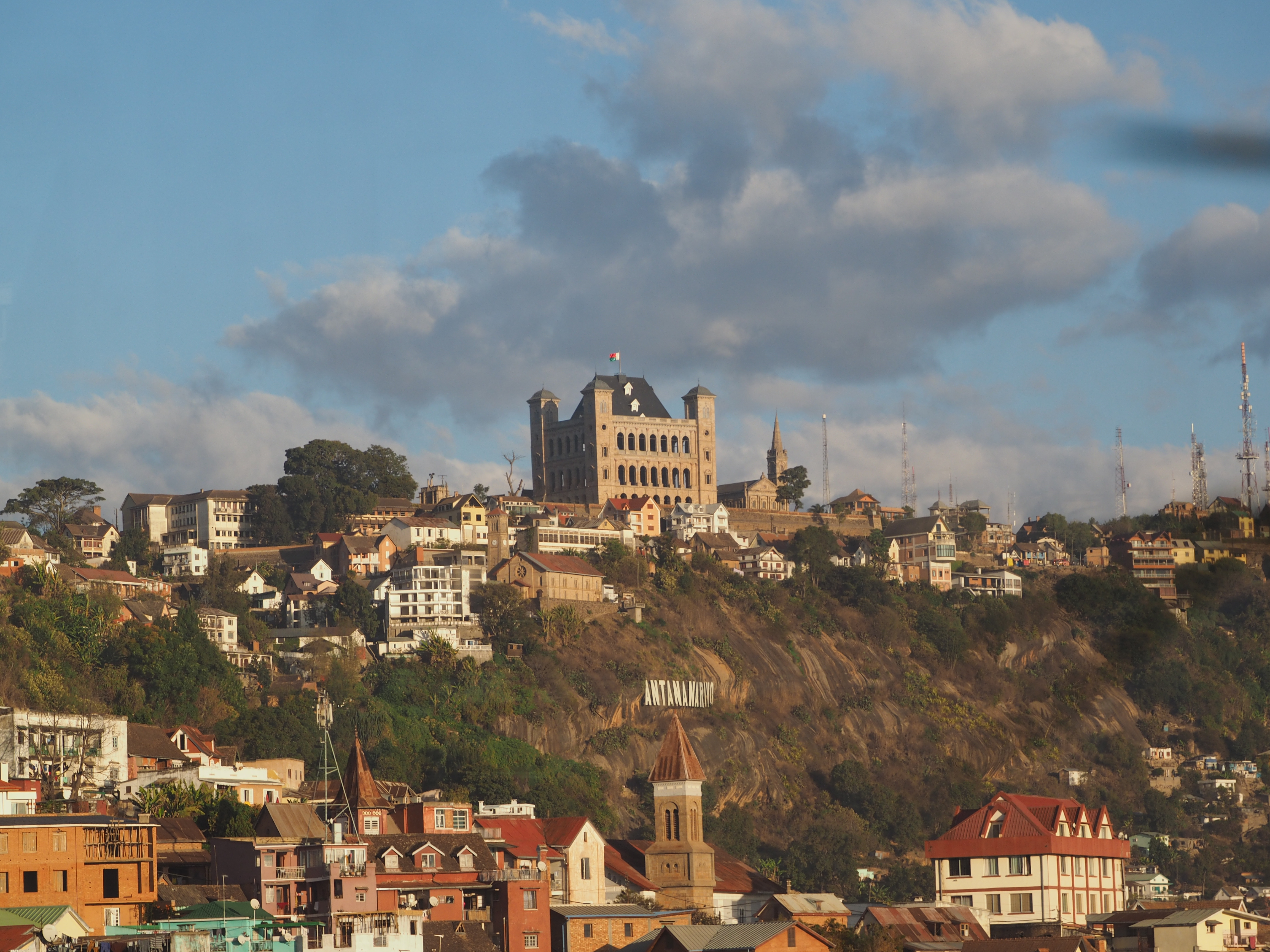 Hotel Colbert is in the middle town which is the commercial centre. From the terrace you look up to the high town which is where the nobility had their palaces, the view is dominated by the Queen’s Palace, the Manjakamiadina, currently under repair.
