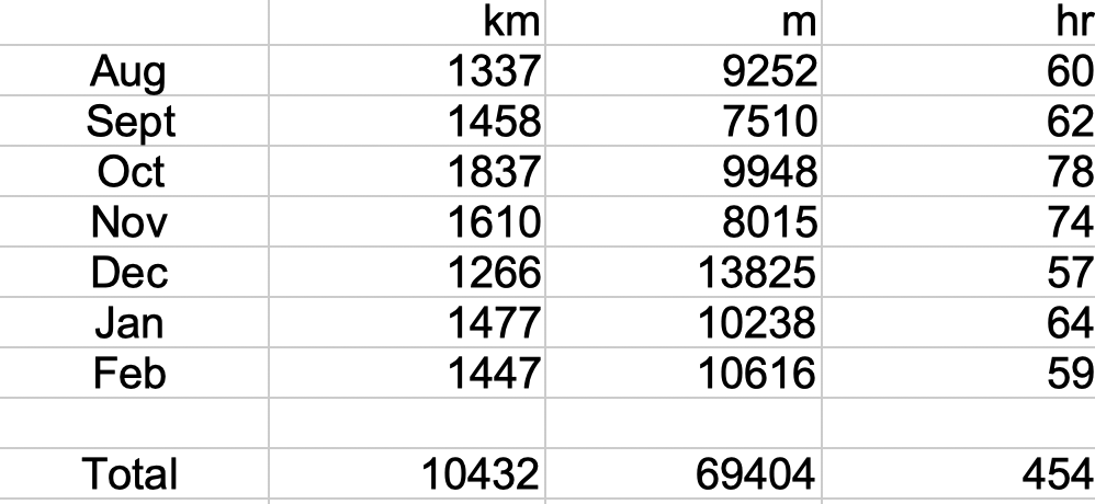 Turning that into weekly averages gives 344km, 2,292m of climbing in 15 hours on the bike.