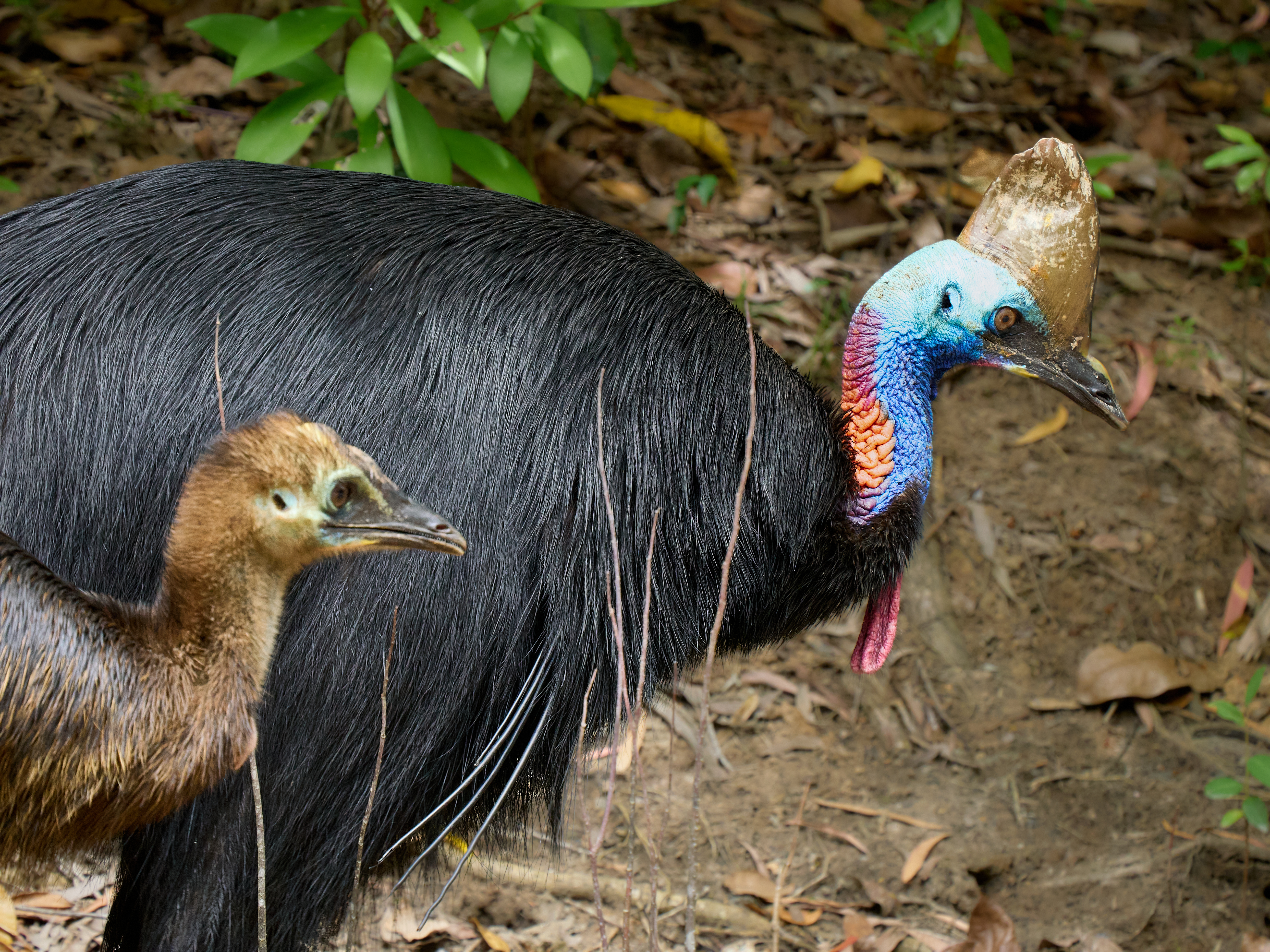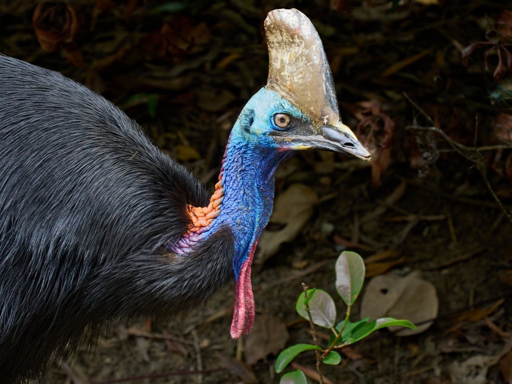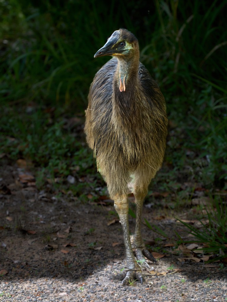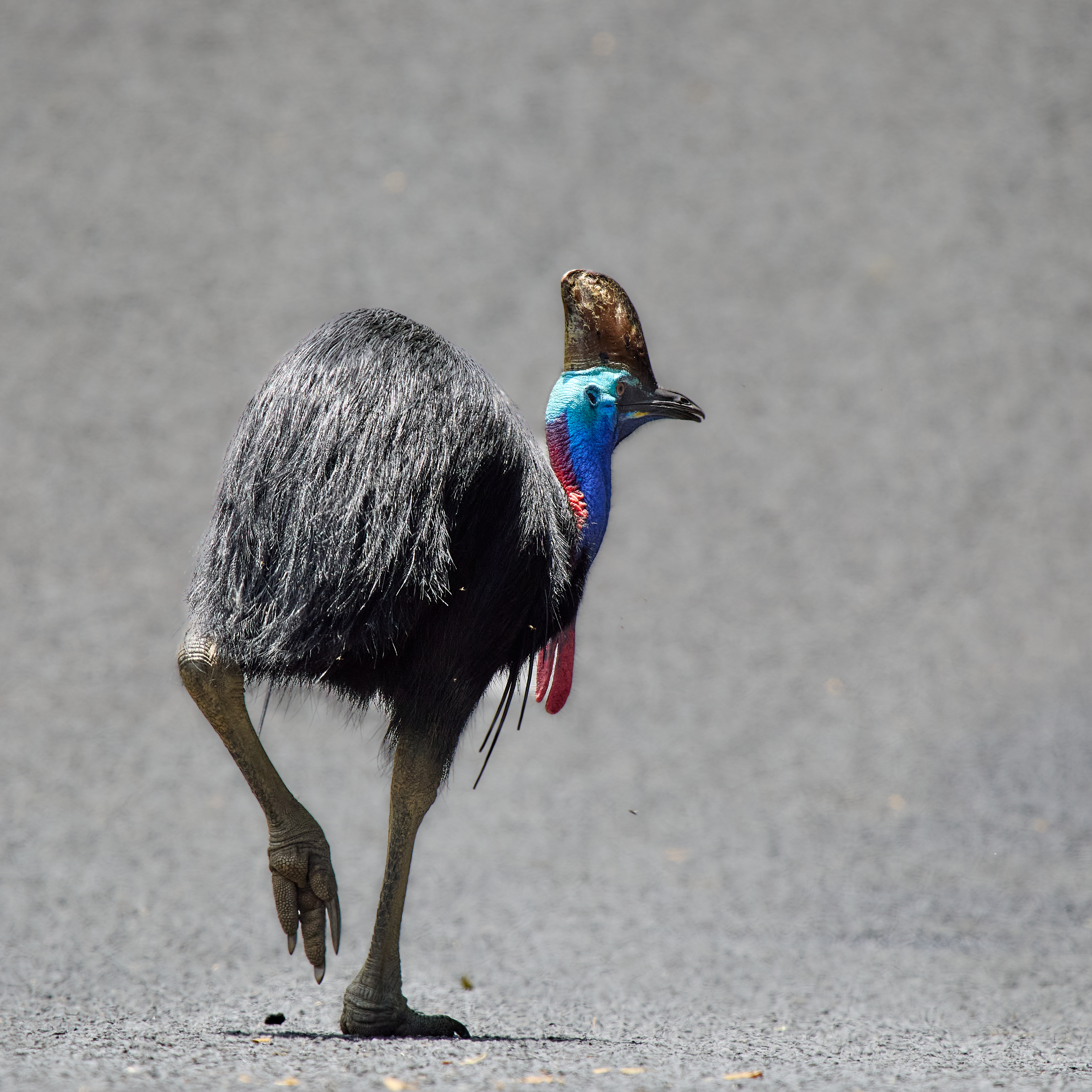 Cassowaries are dangerous. They are the heaviest Australian avian and can inflict nasty wounds with their feet. Don’t be carrying a sandwich when you meet one. Don’t set out to feed them (but do drop the sandwich and back off). I have a very long lens and was no where near as close as the photos imply.