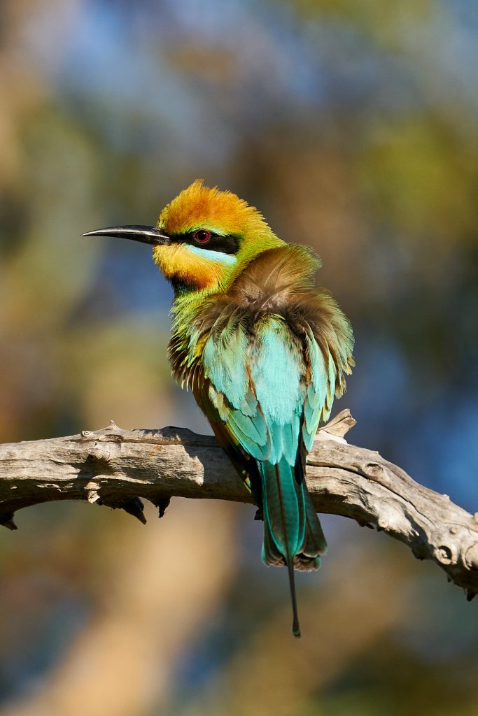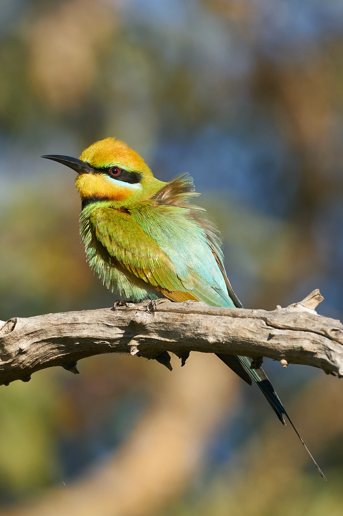It was a windy morning, the feathers are somewhat ruffled but the plumage is otherwise in excellent nick. Rainbow Bee-eaters nest in tunnels in river banks, cliffs or any near vertical surface in soil that’s light enough to burrow into. By the end of the breeding season they look pretty battered.