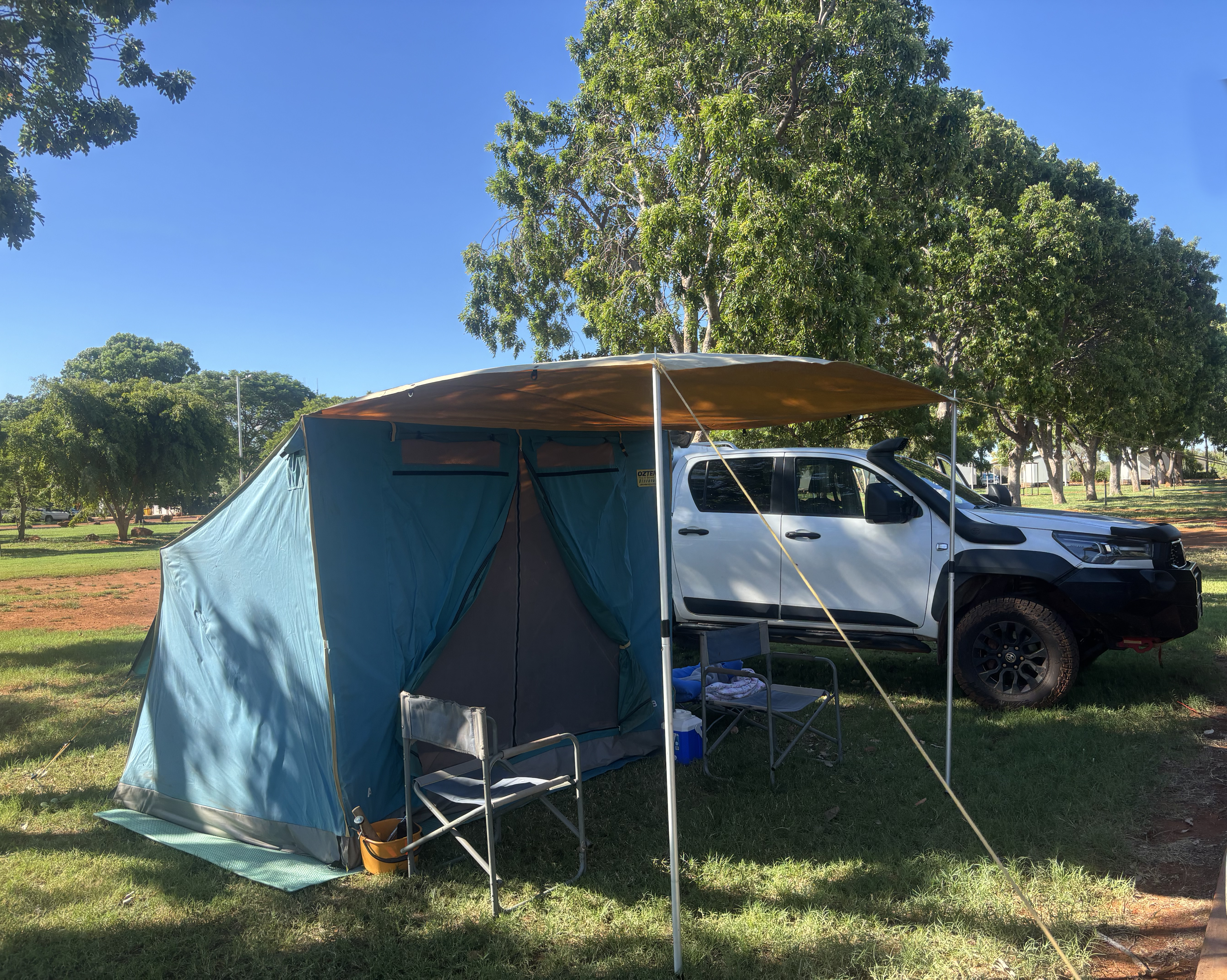 Cyclone Sean is boiling the waters south west of Broome, the Victoria Highway is under water behind us (150mm of rain in 24 hours). There is no retreat! For the moment though there is no need to retreat. Today has been blue sky all day. It seems churlish to complain about the heat … a mere 41ºC (105.8ºF). Just enough to dry out the tent. We are about half way to the east coast.
