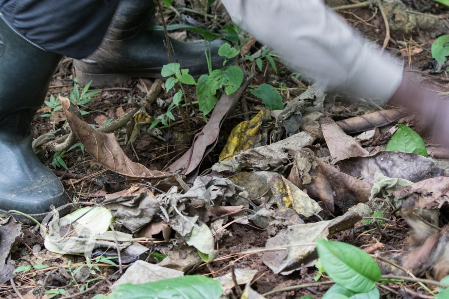 We then turned our attention to an area closer to the edge of the forest and Ofen found the first snare. To sharpen our eyes the rest of us were invited to find it as well. It took a while but helped develop a search pattern. Find the Duiker trail, look where it narrows, look very carefully in the foliage. Also look for a cut stick about two metres long, there isn’t always a sapling or tree conveniently placed where the snare is to be set. Even if the stick comes free from the ground it will soon get caught in a narrow place on the trail. No point these days looking for the traditional marks, the poachers know that the patrollers will find them all too easily.