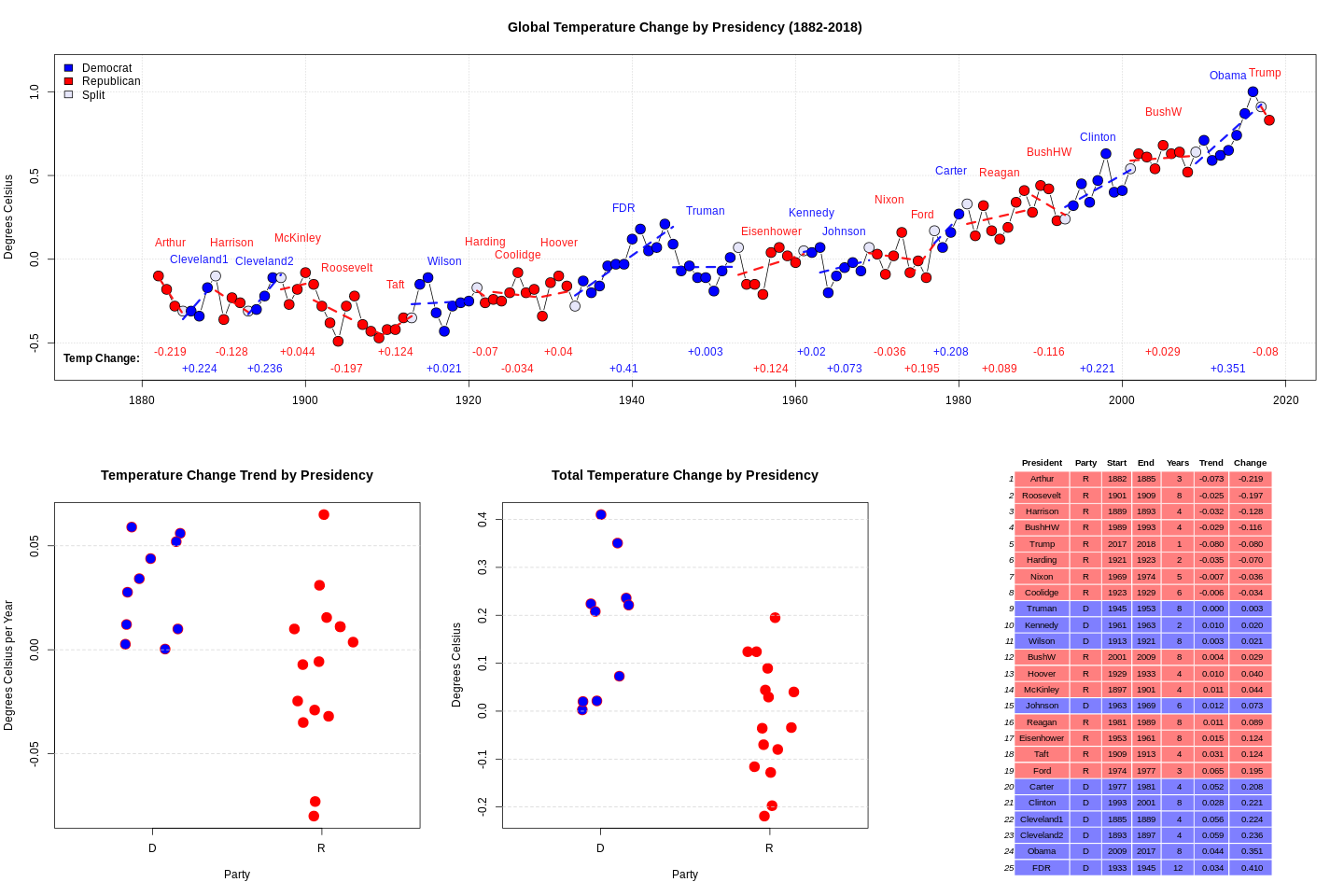 It turned out all 8 administrations who oversaw a cooling trend were Republican. There has never been a Democrat president who oversaw a cooling global temperature. Also, the top 6 warming presidencies were all Democrats.