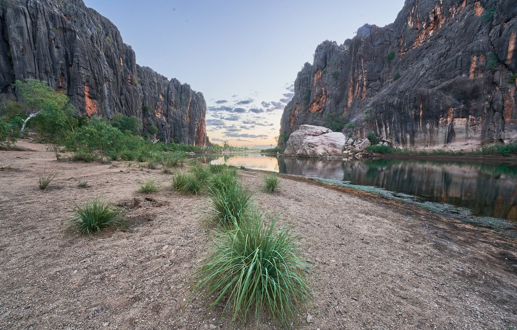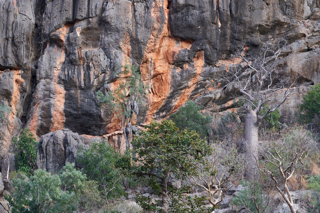 The Kimberley is famous for its many, very beautiful sandstone gorges but this one is limestone. During the Devonian, that’s 419 MYA (million years ago) to 350 MYA plus or minus a few minutes at each end, this area was beneath a shallow sea. Lime secreting organisms were busily creating a reef that we now see as the Napier Range. The Fitzroy River has cut through the range giving us Geike Gorge, Windjana is the work of the Lennard River and Barker Gorge owes its existence to the Barker River.