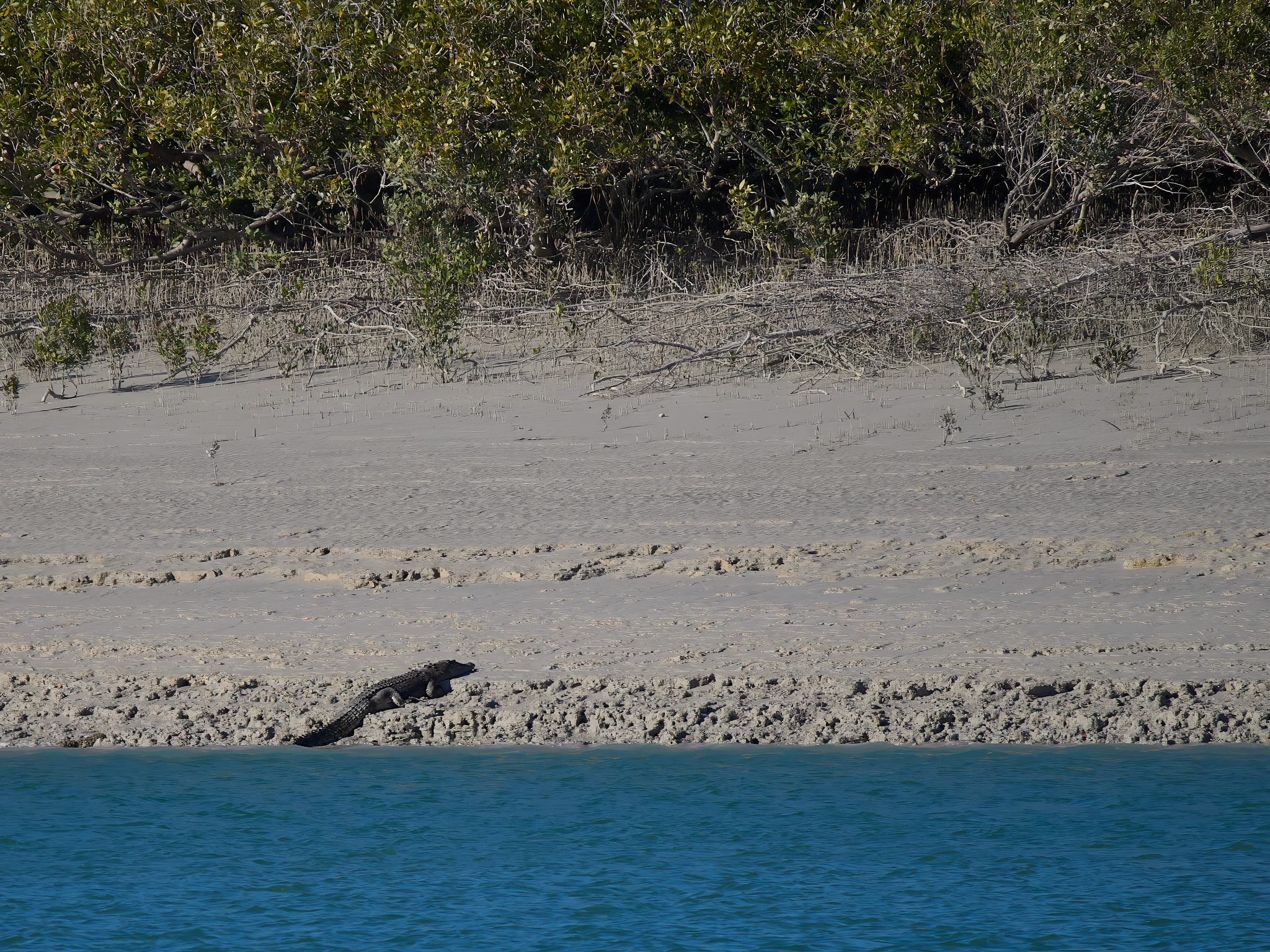 I went for a wander and soon had the perfect view of a crocodile hauled out on the beach. Not, perhaps perfect for a photo, but perfect for an encounter. The best place for closer encounters is the Malcolm Douglas Wildlife Park. We were there recently. A top priority for a croc farm is ensuring the visitors are not eaten by the residents. Photography is not a high priority at our croc farm, too many fences … but you can hold little crocodiles (adorable). So, compare and contrast crocodile photography wild versus captive (you shouldn’t have any trouble working out which is which) …