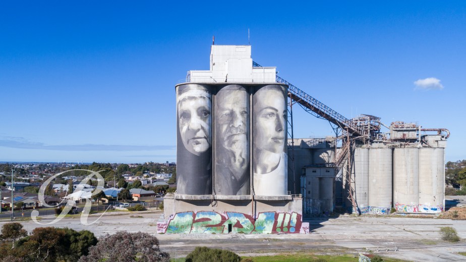 Another silo beautified, this one in a more urban setting. It is the old cement works overlooking Fyansford on the outskirts of Geelong, Victoria. The artist is Rone who has done great things in New York and London and has come home to Geelong for this project. The subjects are local folk. From left to right we have Corinna Eccles, a Wadawurrung elder, Cor Horsten who worked at the site for 35 years and Kelly Cartwright, an athlete who won gold in the long jump and silver in the 100 metres at the London Paralympics in 2012.
