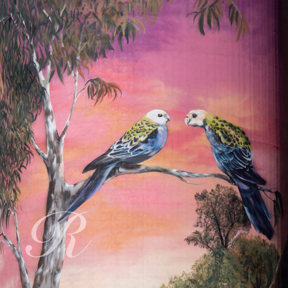 The artist is Jimmy Beattie aka Dvate and the subjects are a Squirrel Glider and a Sacred Kingfisher. The glider is a rare resident in the woods along the Campaspe while the kingfisher is a fairly common and colorful summer visitor. The medium is acrylic on silo.