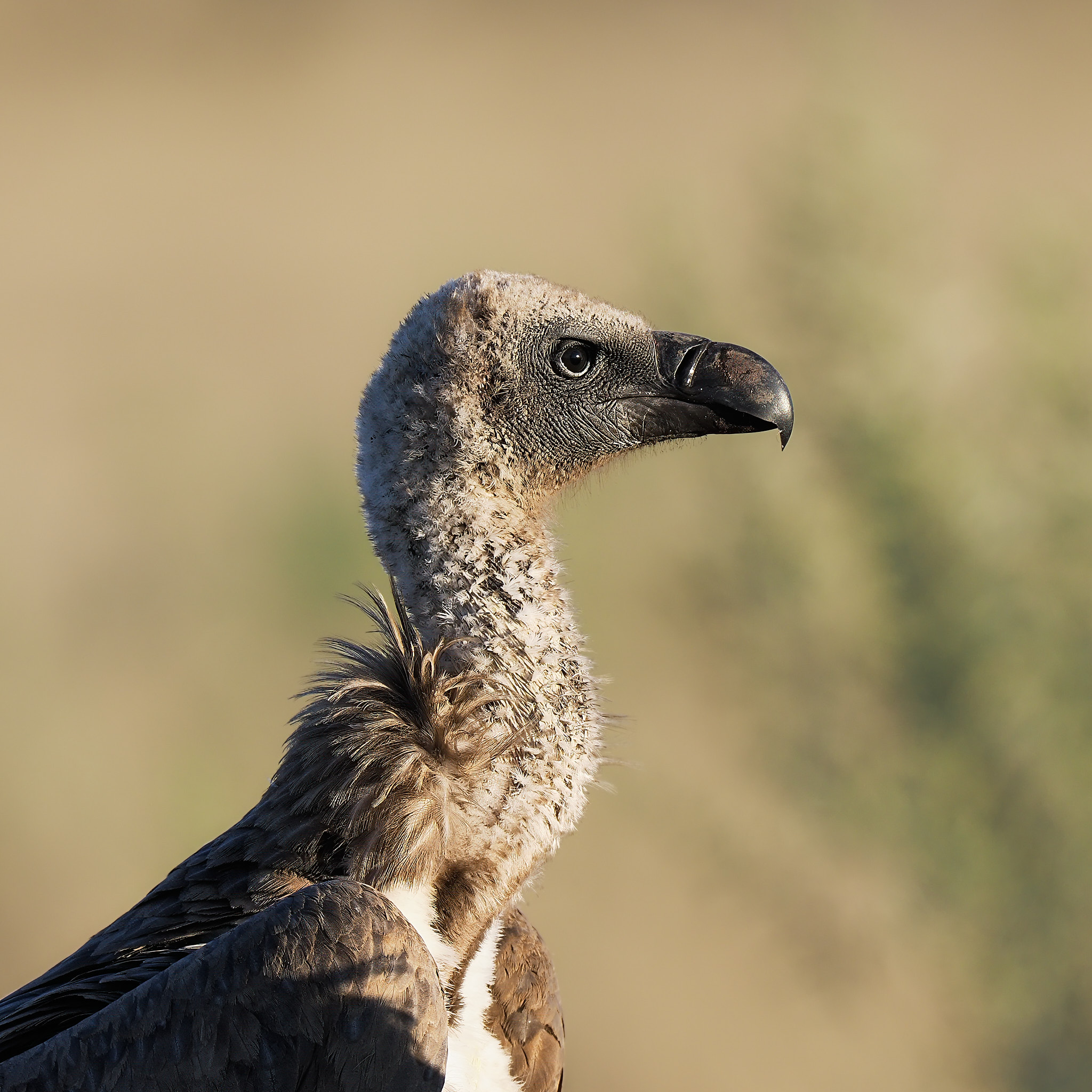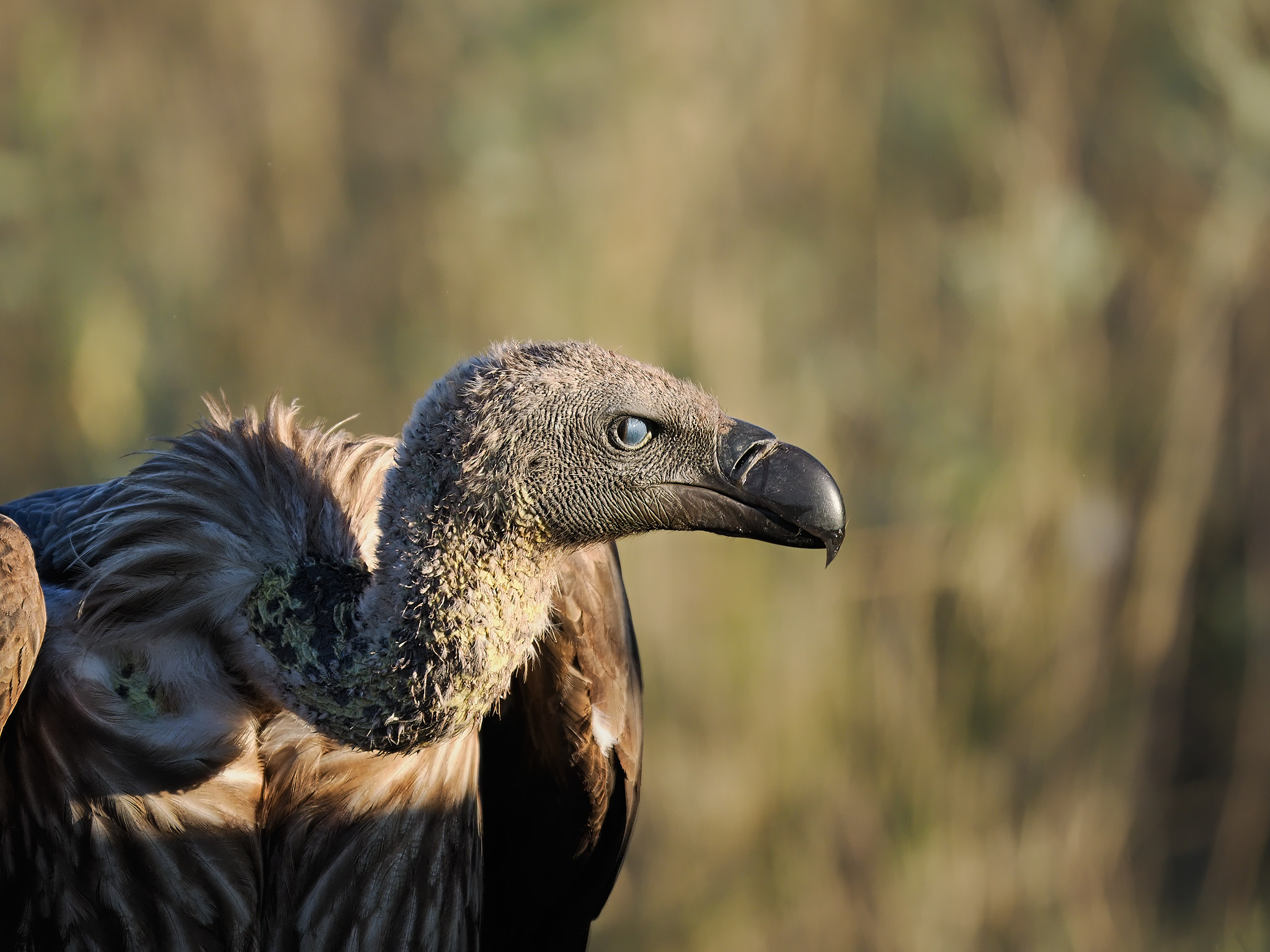 Birds have a third eyelid, the nictitating membrane, that runs fore and aft protecting and lubricating the eye. It can be seen clearly in the next photo. A powerful hooked bill is useful for tearing flesh. A naked face is easy to keep clean and a pompom-like collar helps keep blood from running down and soiling the wing feathers.